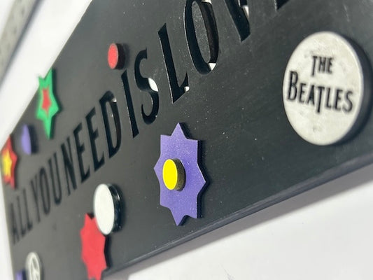 SIZE: 14"x4"x1/4" QUOTE: "All you need is love" MATERIALS: Wood, acrylic & oils. HANDMADE -...