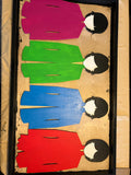MATERIALS: Wood, cloths, strings, plastics, felt, papers, metals, acrylics and oils.