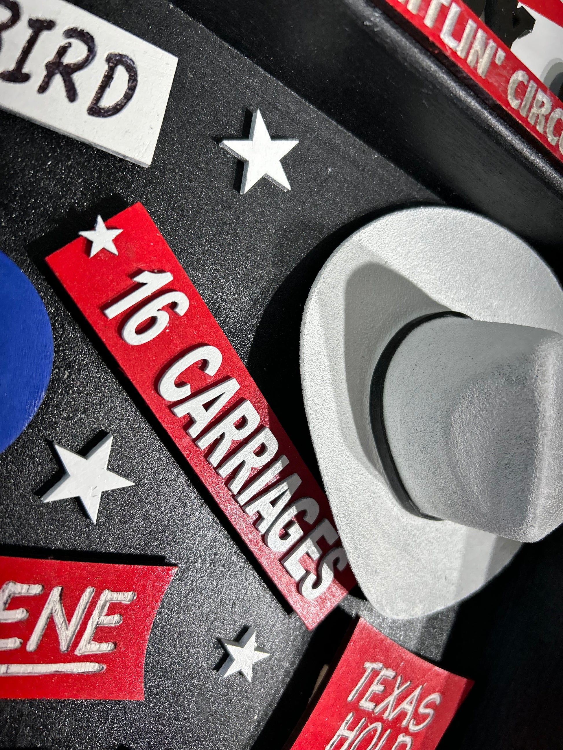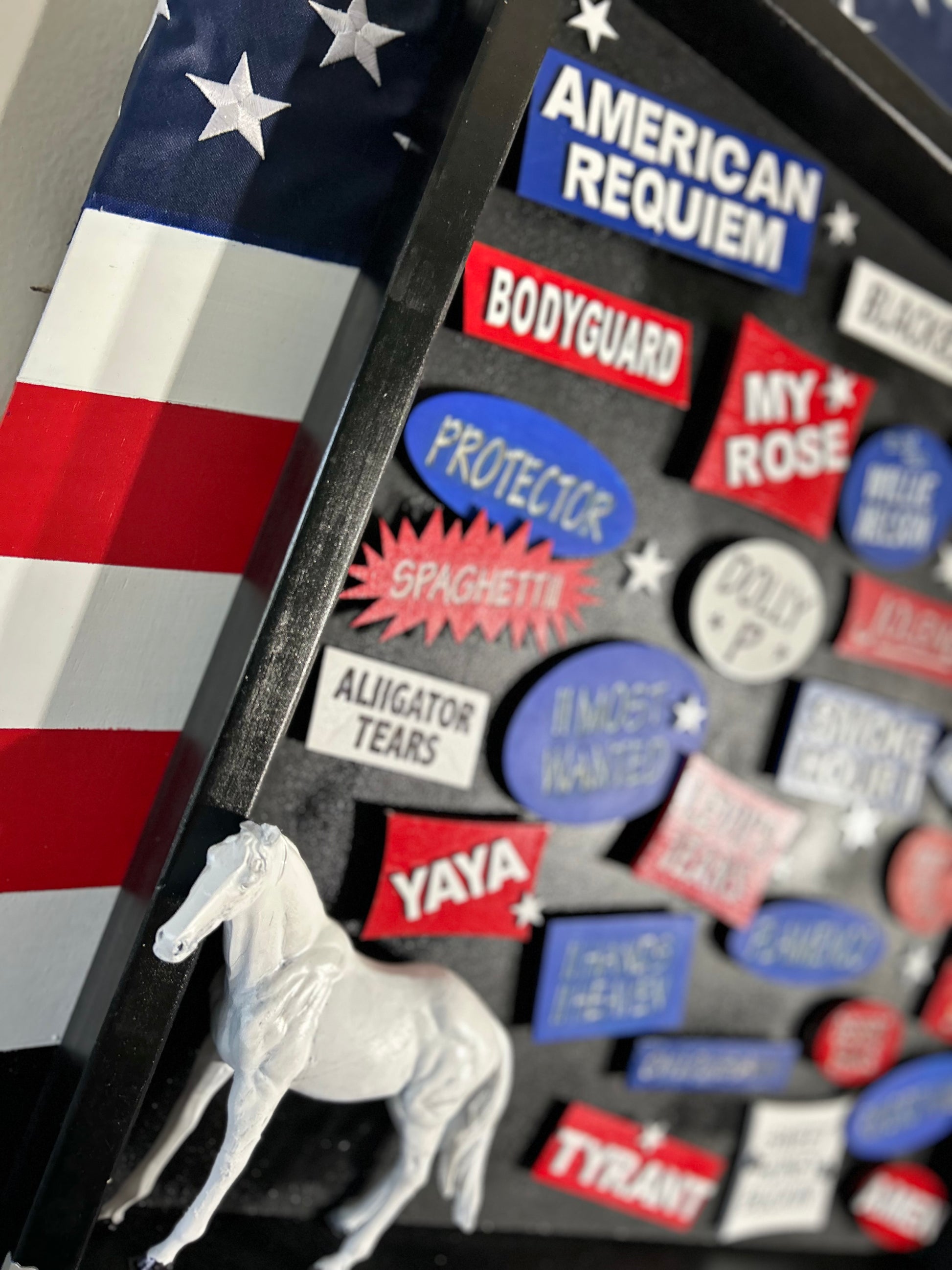 MATERIALS: Woods, plastics, metals, felt, cloth, acrylics & oils.