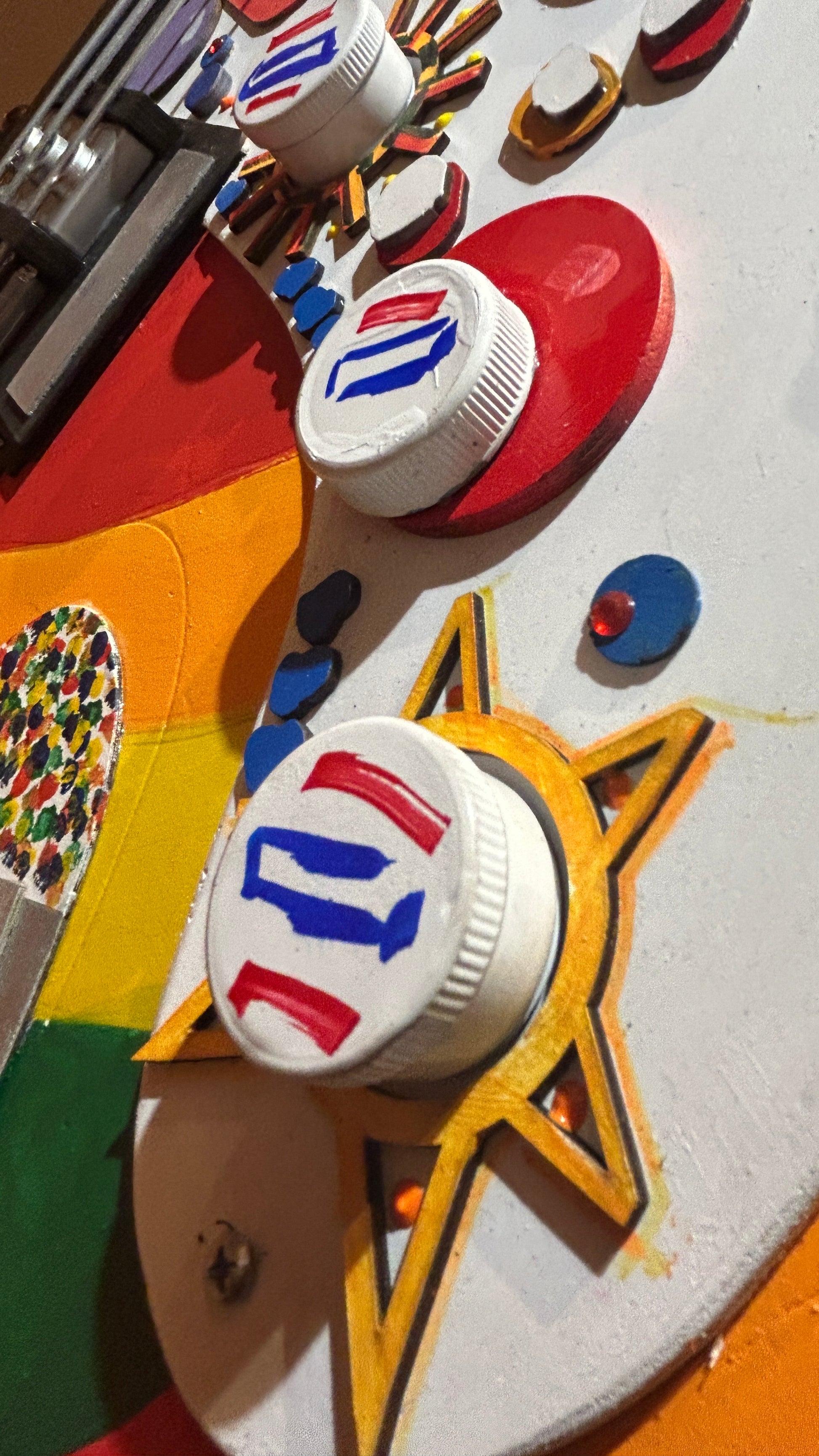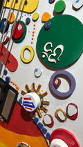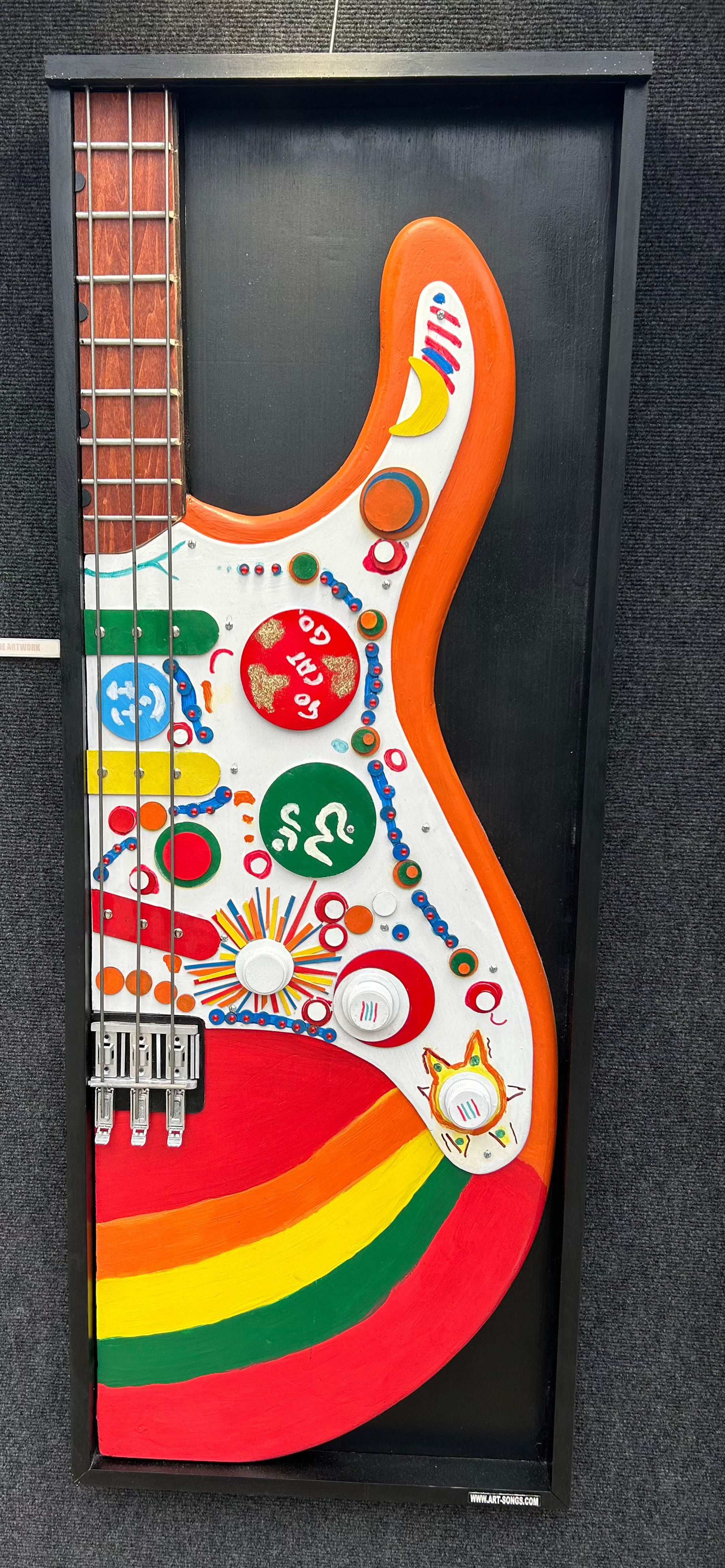 Large size replica of George Harrison's "Rocky". His guitar in Magical Mystery Tour. This replica is 130% of the actual size. And no, you can't play the strings, it's not a real guitar..! George's freehand art in his guitar, I did my art interpretation a bit more organized with cutout shapes to follow my signature 3D style. The main difference is that he did his freehand and high, and I did mine with tools and sober...lol