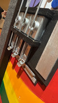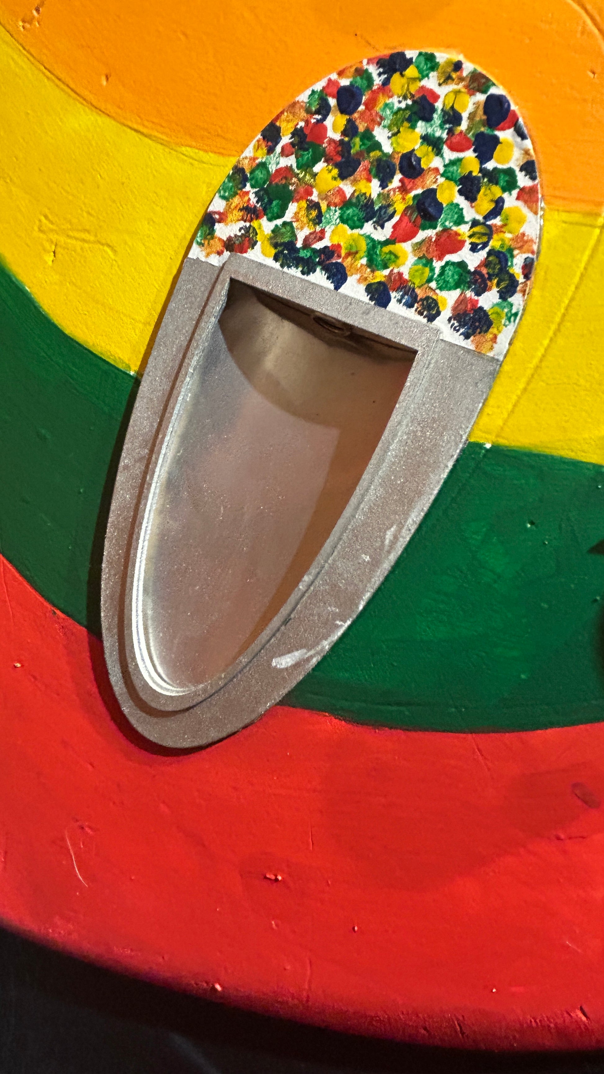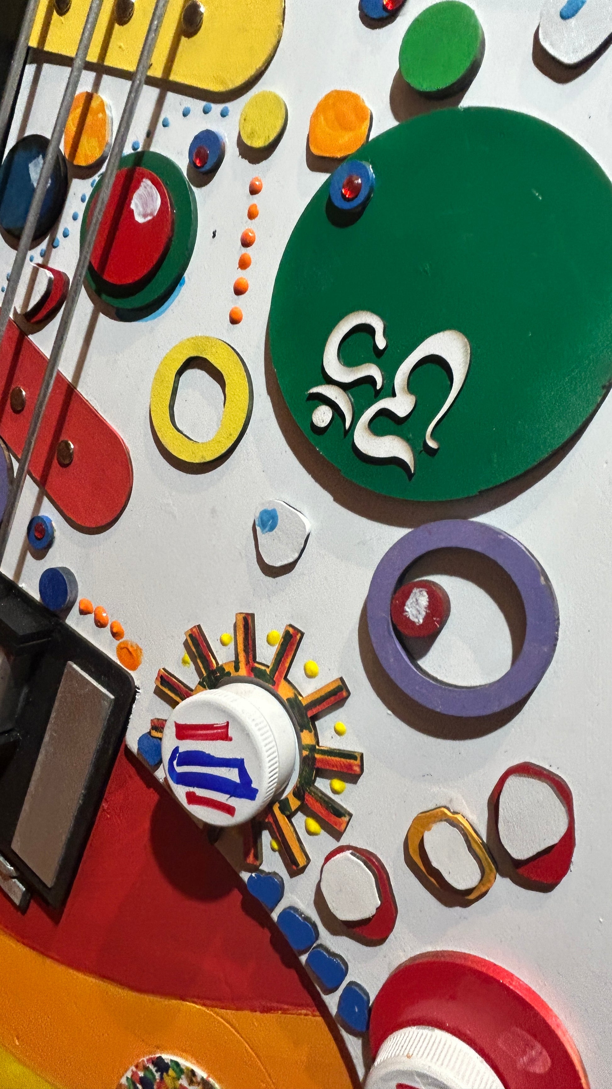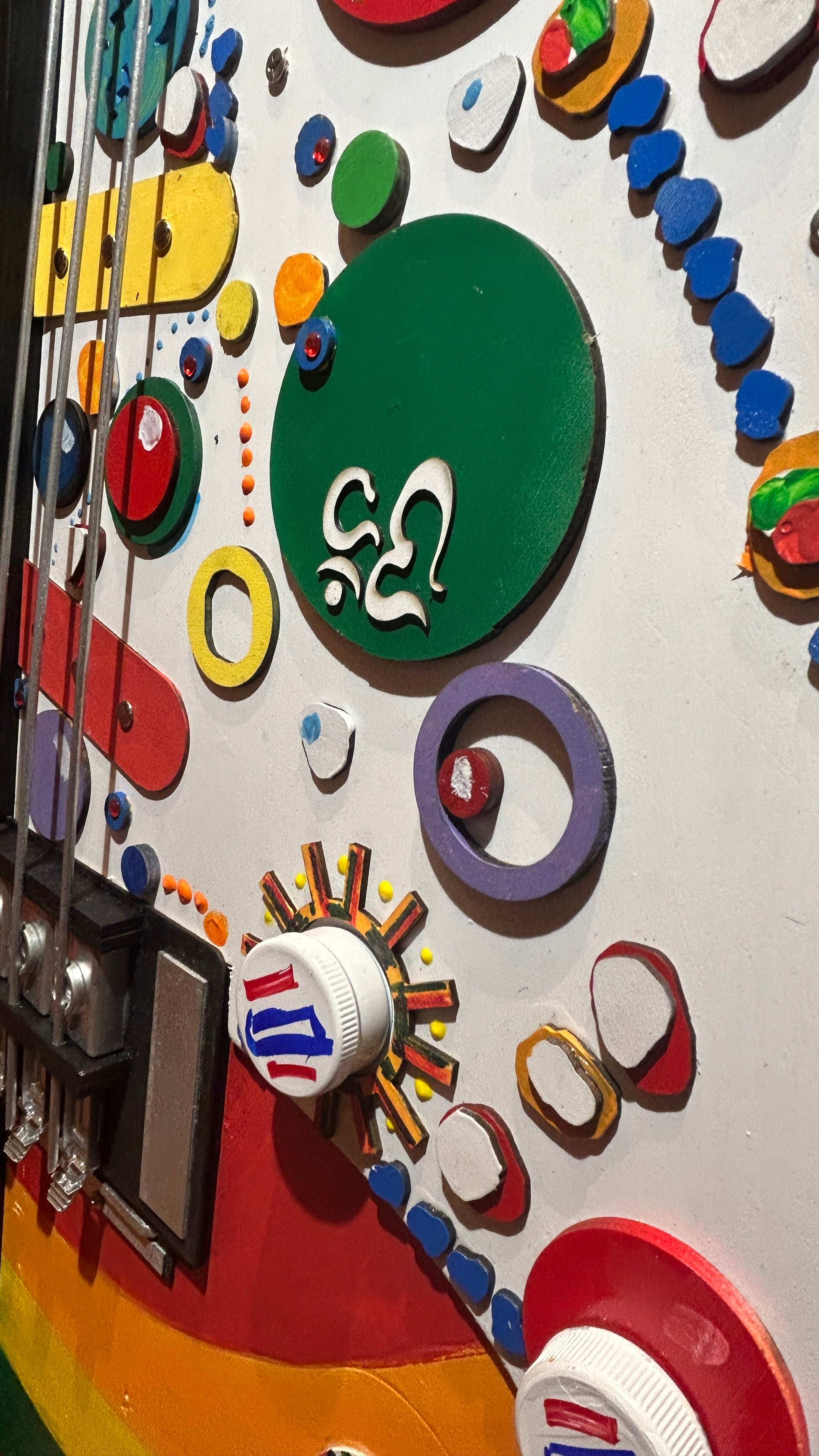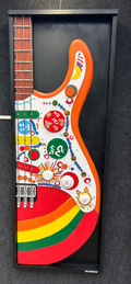 Large size replica of George Harrison's "Rocky". His guitar in Magical Mystery Tour. This replica is 130% of the actual size. And no, you can't play the strings, it's not a real guitar..! George's freehand art in his guitar, I did my art interpretation a bit more organized with cutout shapes and forms to follow my signature 3D style. The main difference it's that he did his freehand and high, and I did mine with tools and sober....LOL