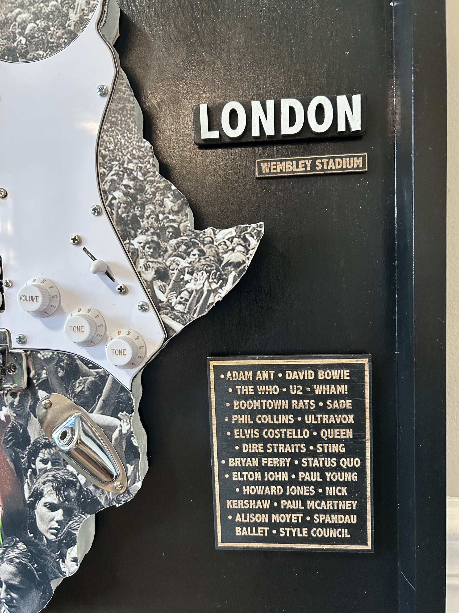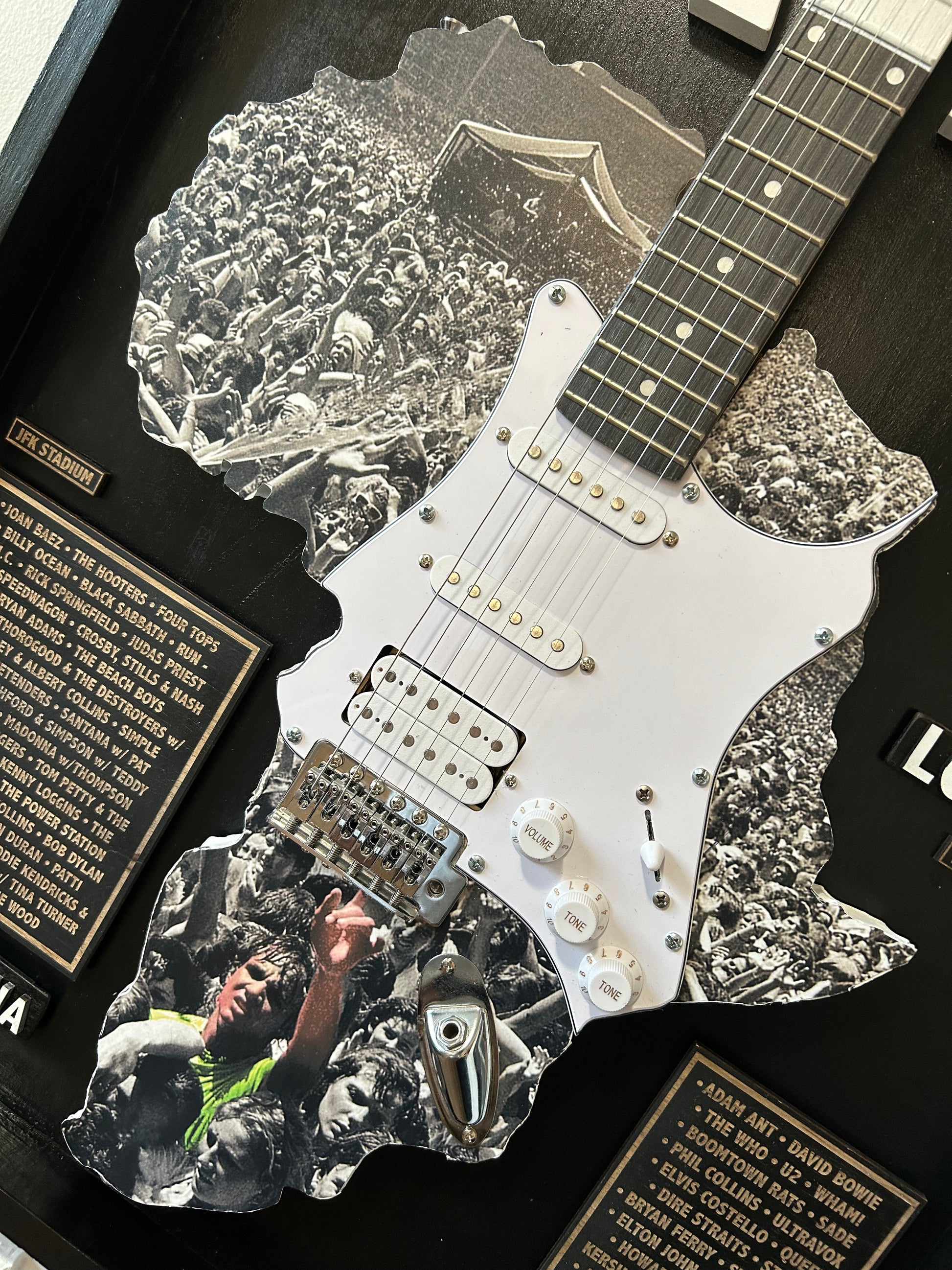The guitar's body is covered with a photograph from the London concert provided by my client and the original entrance ticket for the event.