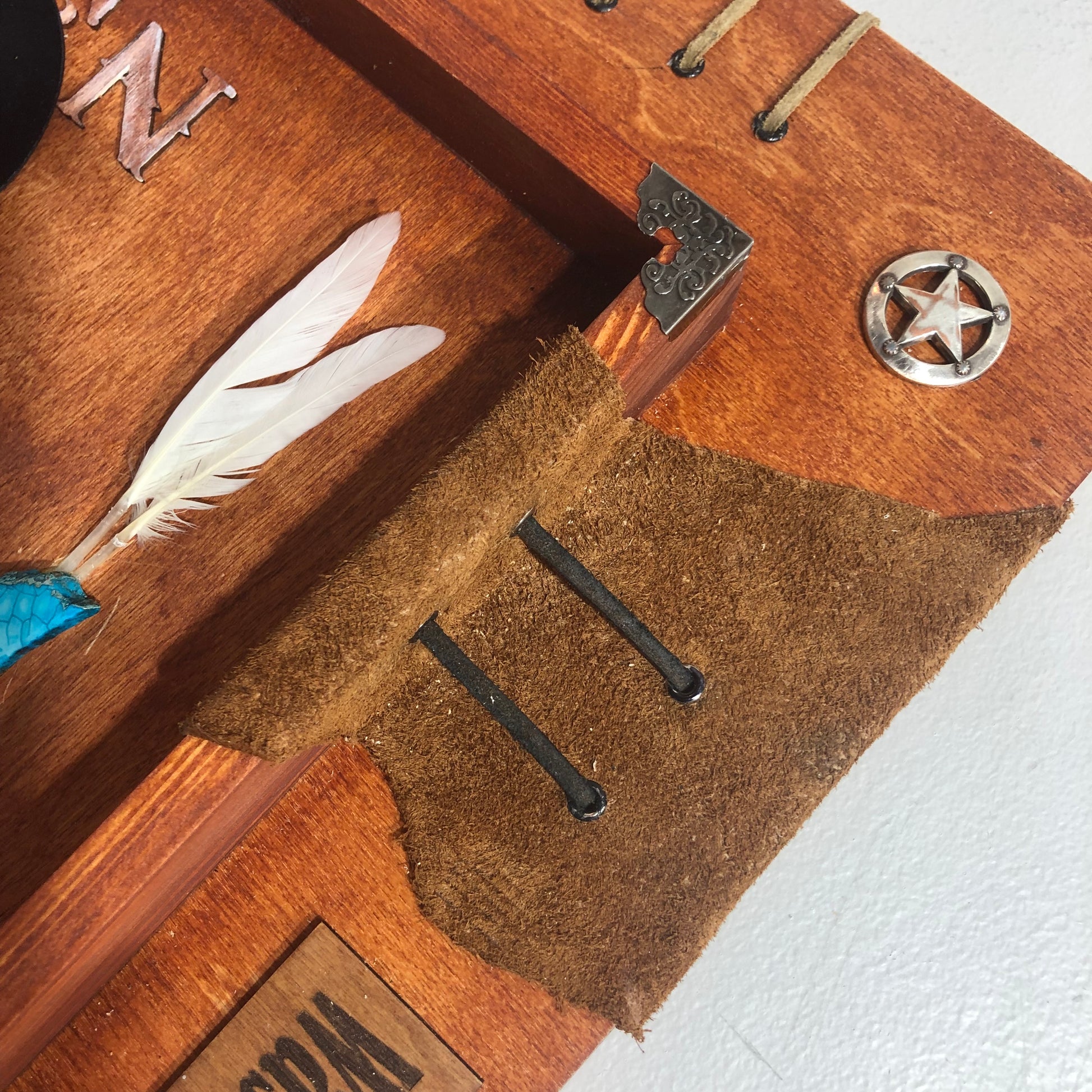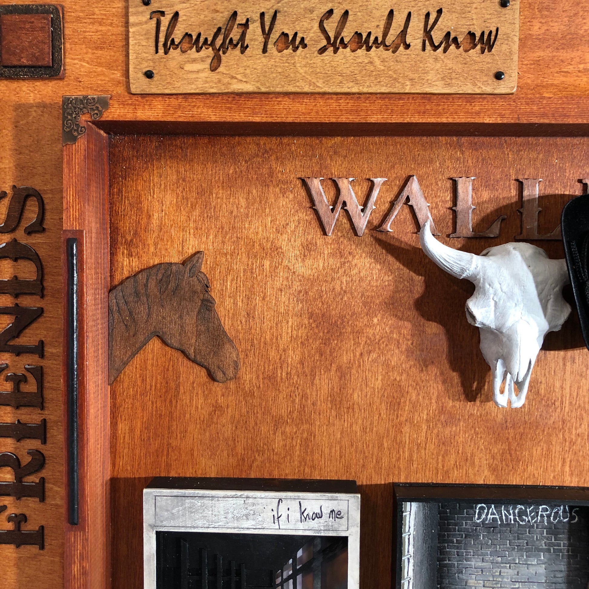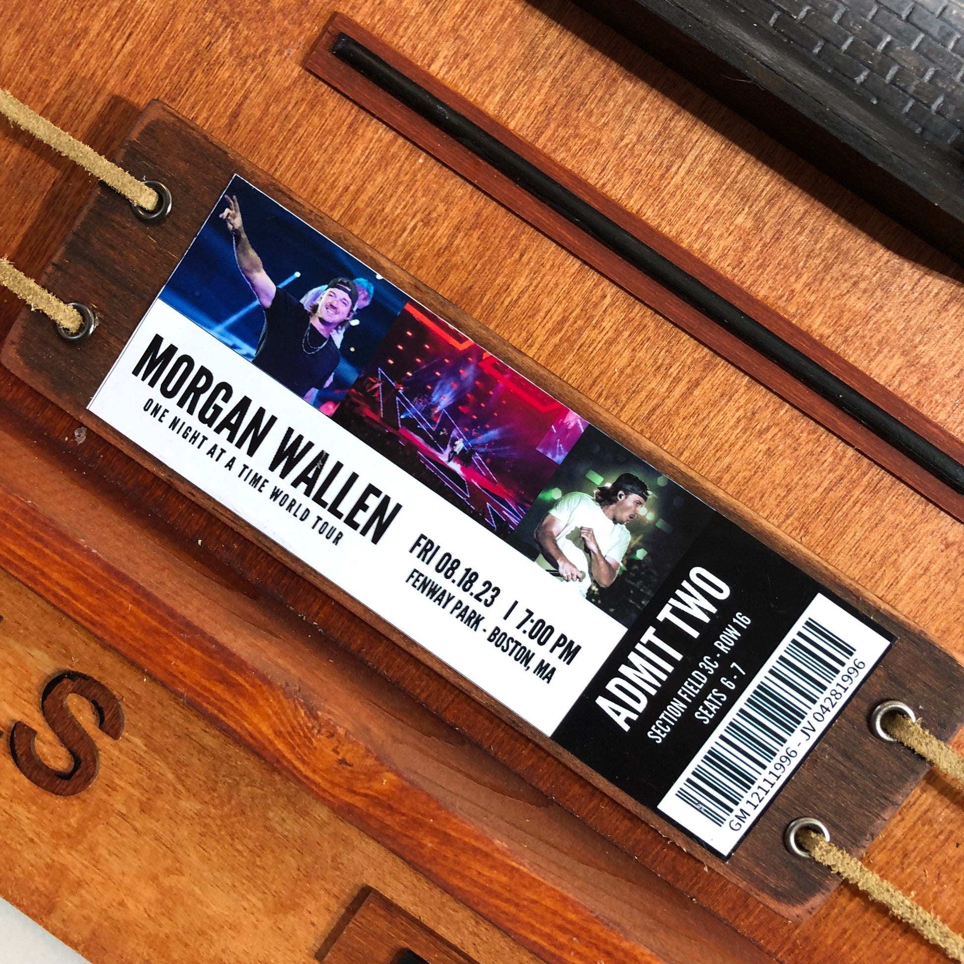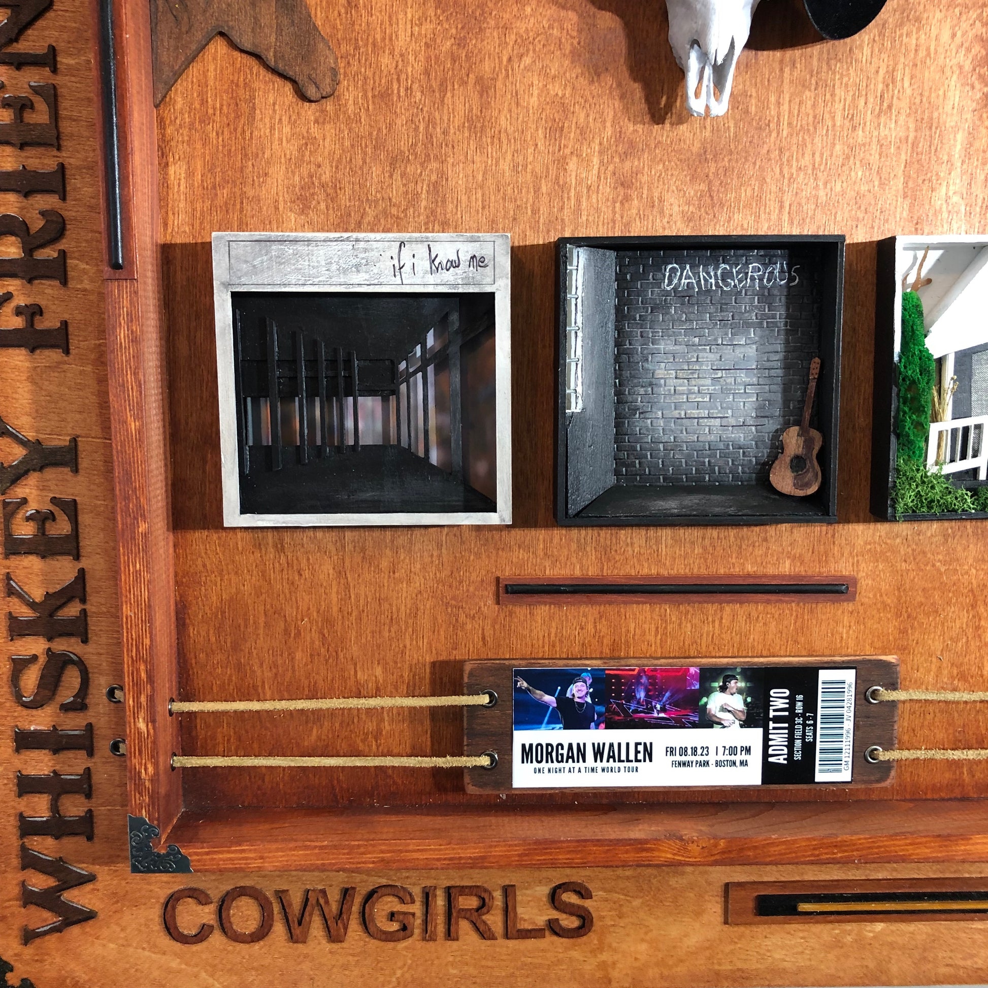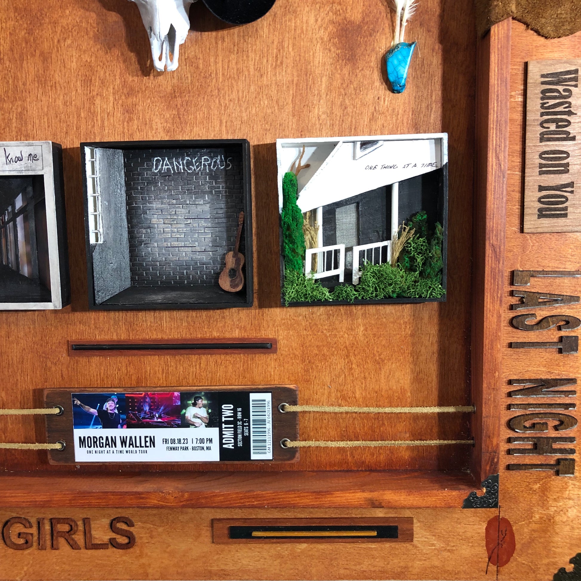 I still cant get over this piece. Going to the Morgan Wallen concert was a check on my bucket list and i was surprised with the most incredible way to remember the best night of my life. Every time i look up at my wall I have flashbacks singing my favorite songs (all written out on the artsong). This artwork speaks way more than a photo or video taken at the concert. The amount of detail that went into it... it even has the exact concert ticket with custom barcode with my boyfriend and I's birthdays. I love the use of natural elements like wood and leather that give it that real country feel. Not to mention it gives warmth and conversation to my very minimal all white bedroom. Thank you Pops!