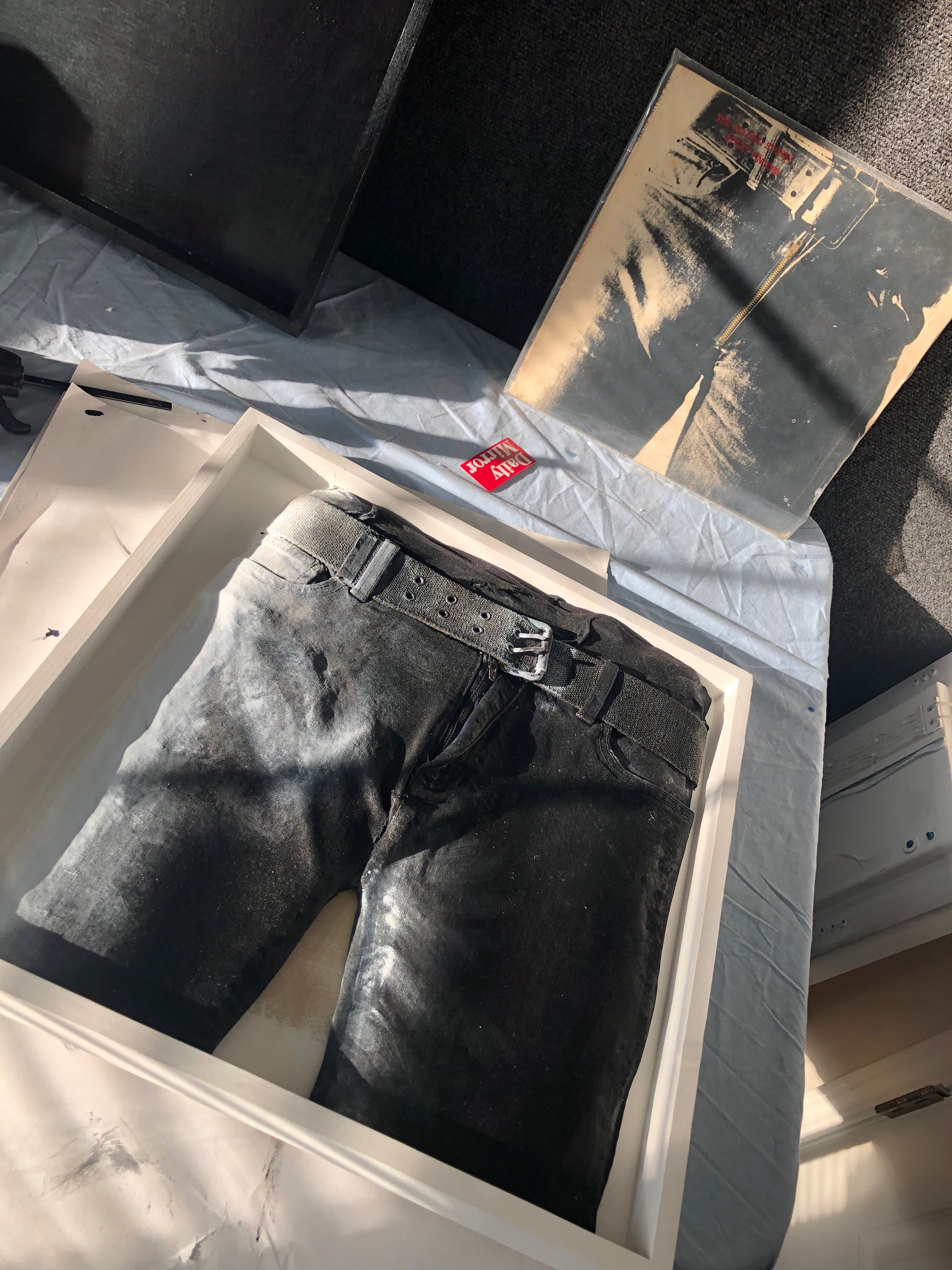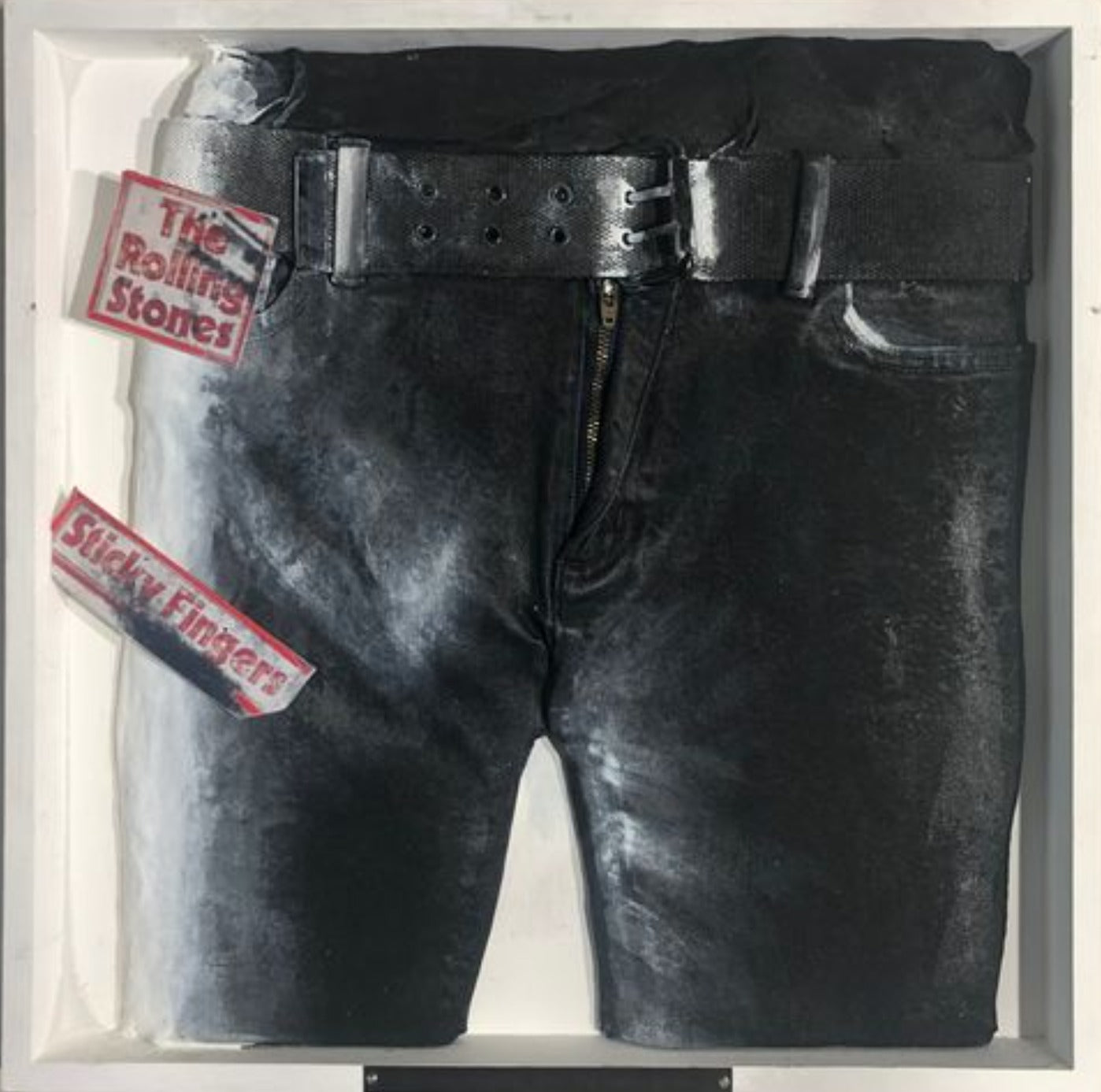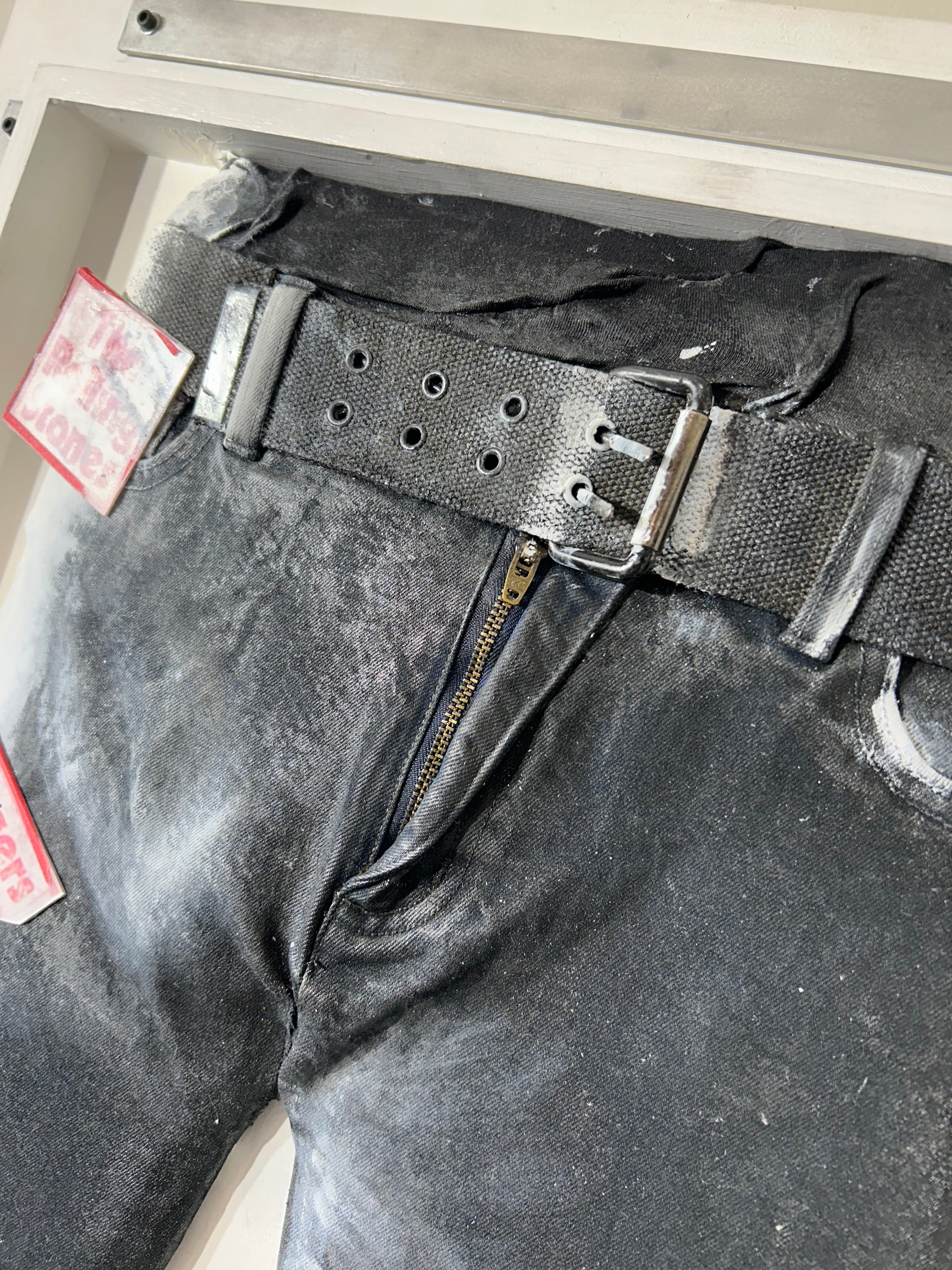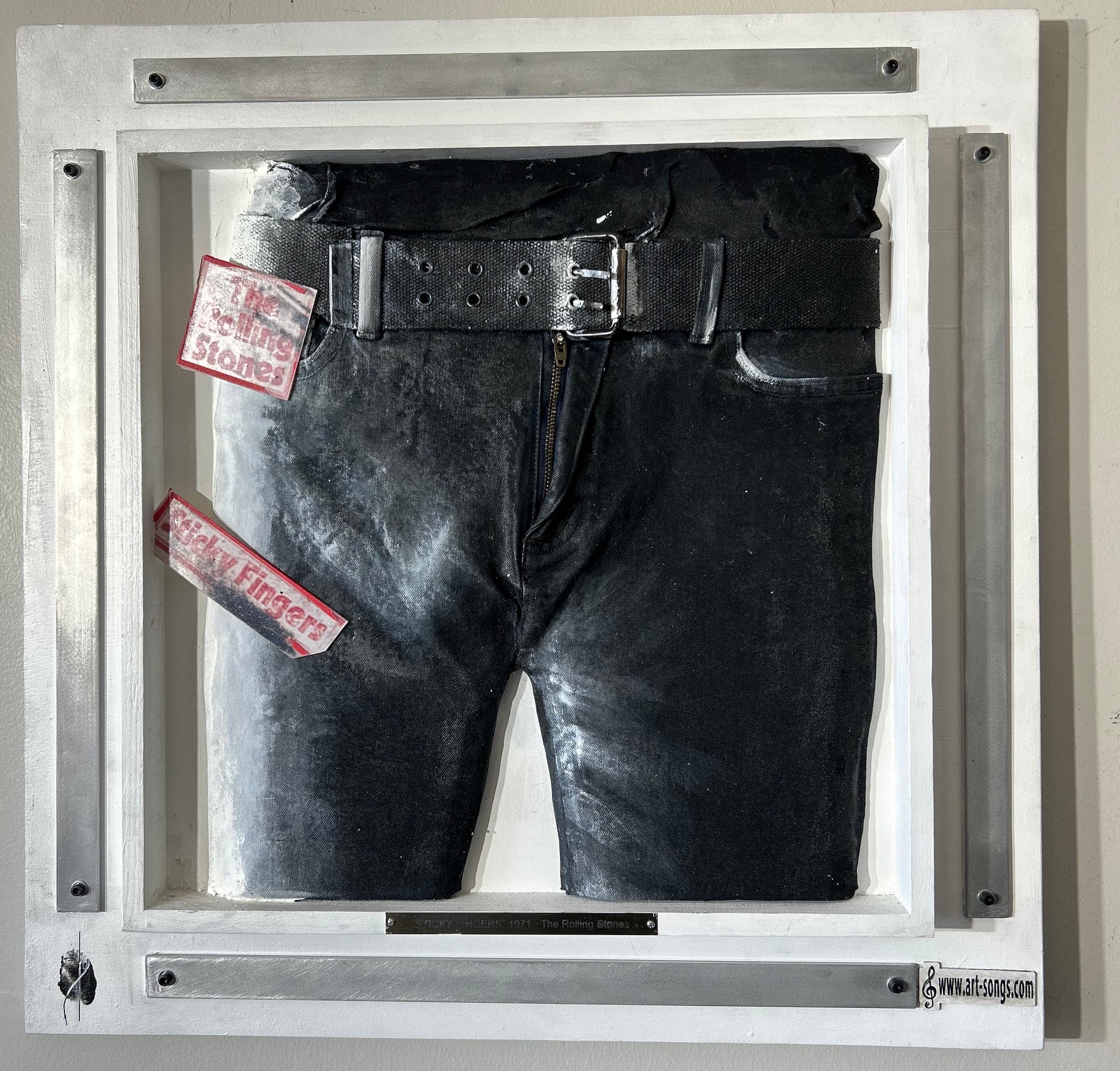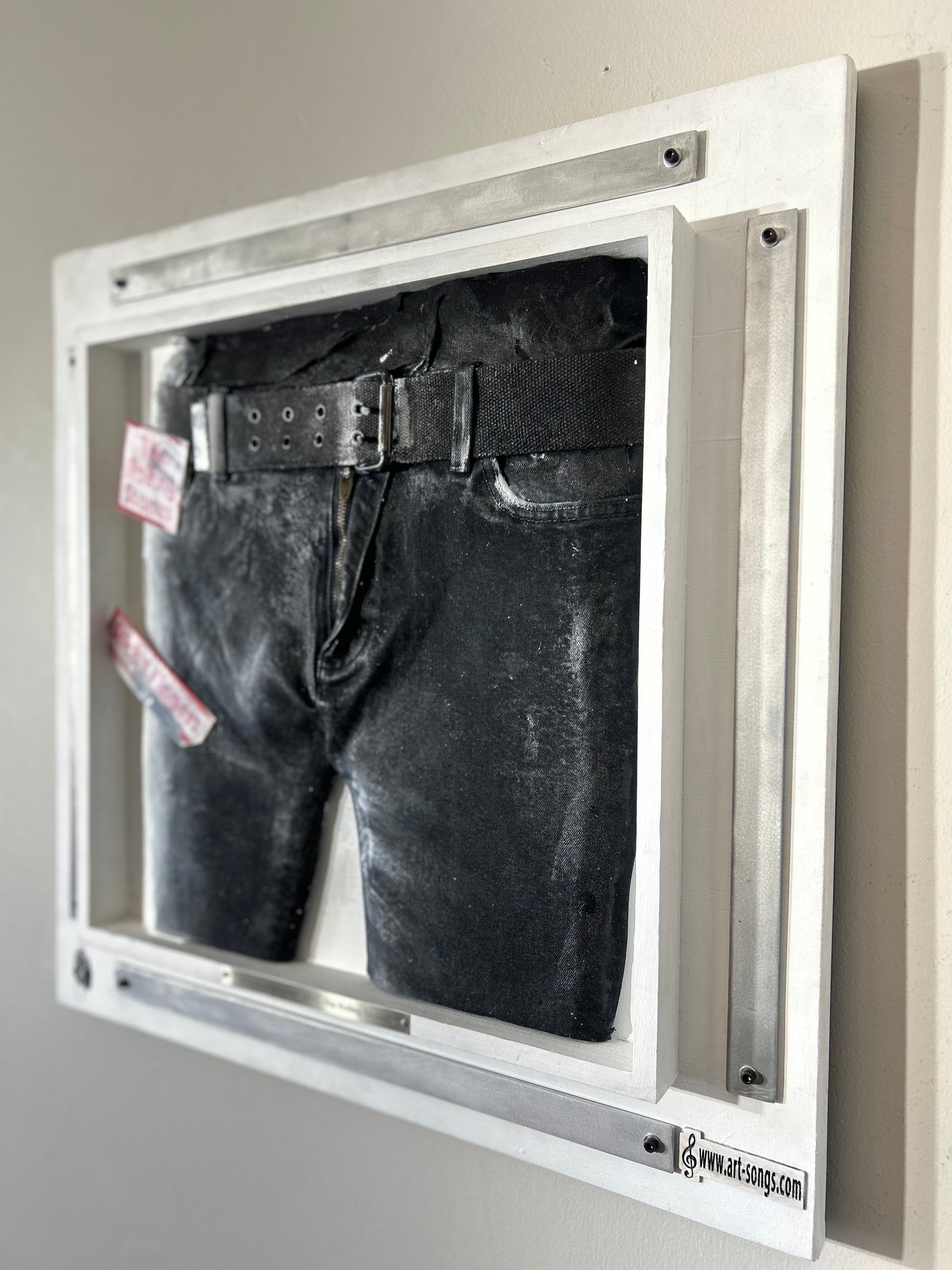 MATERIALS: Jeans with working zipper, cloth, metal chains, woods, acrylics & oils.
