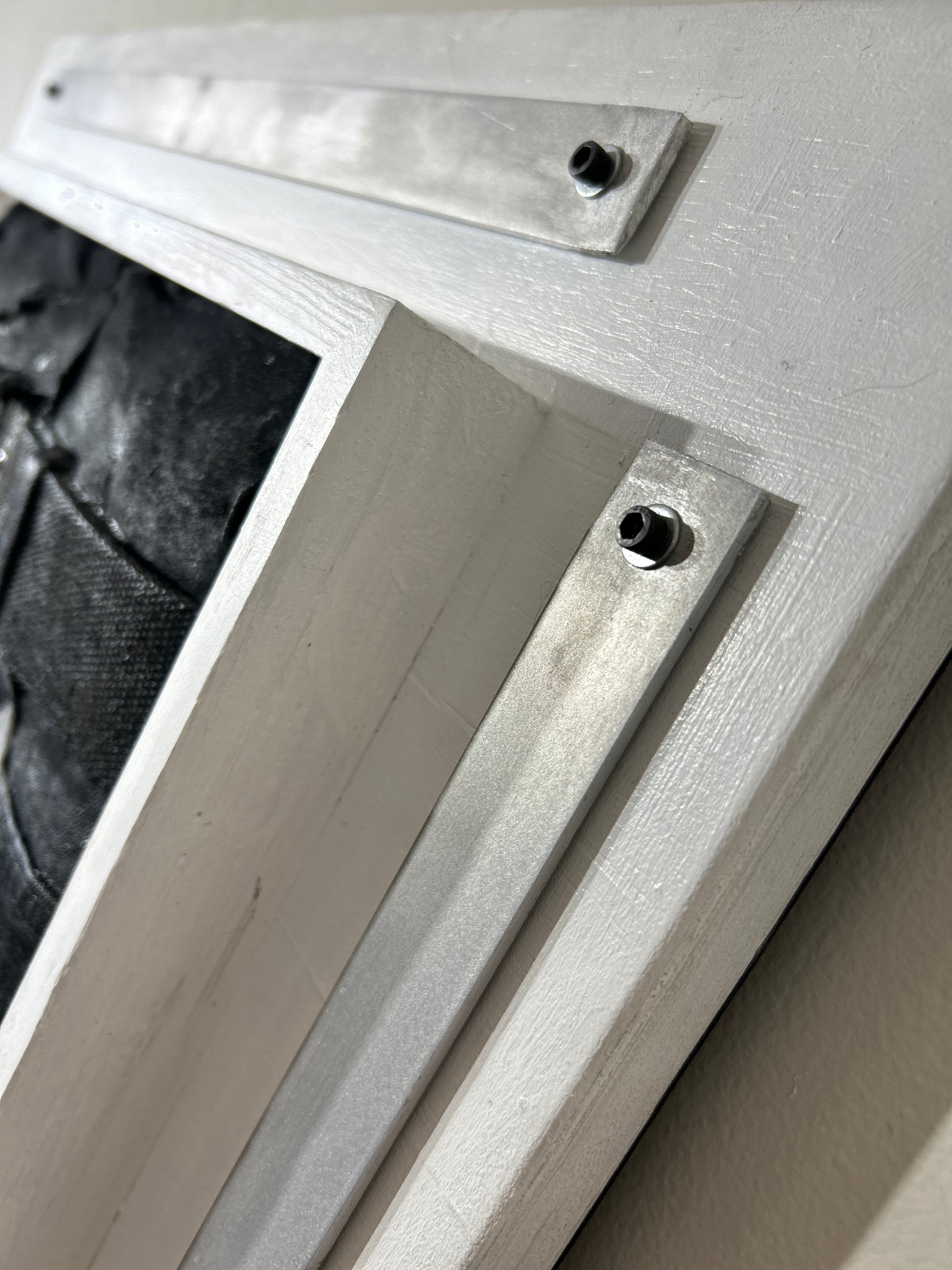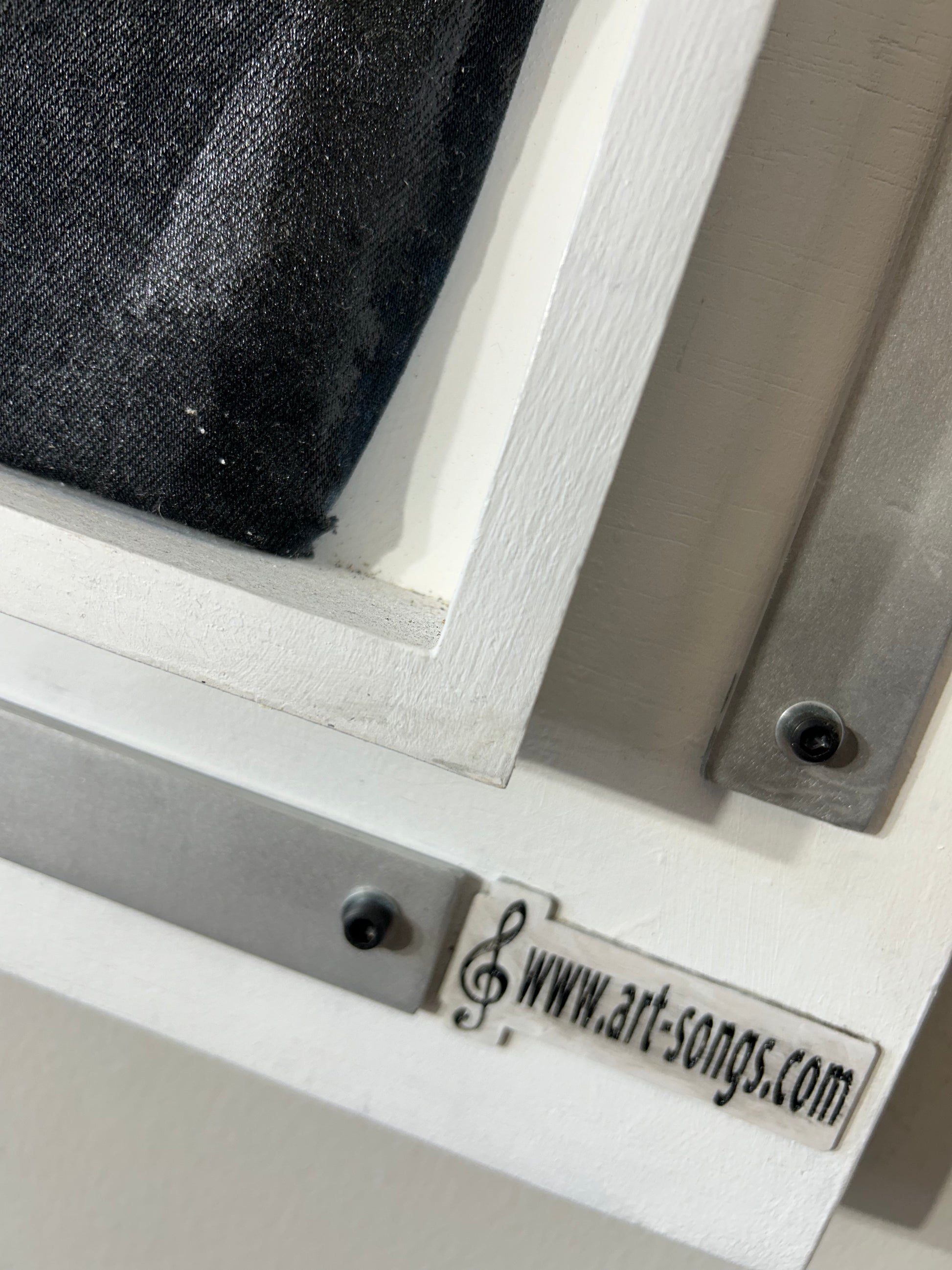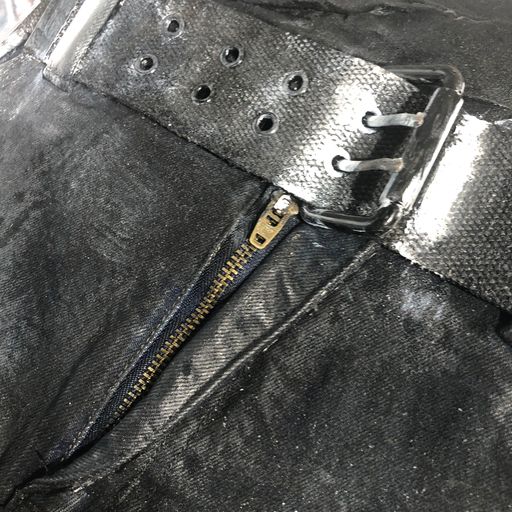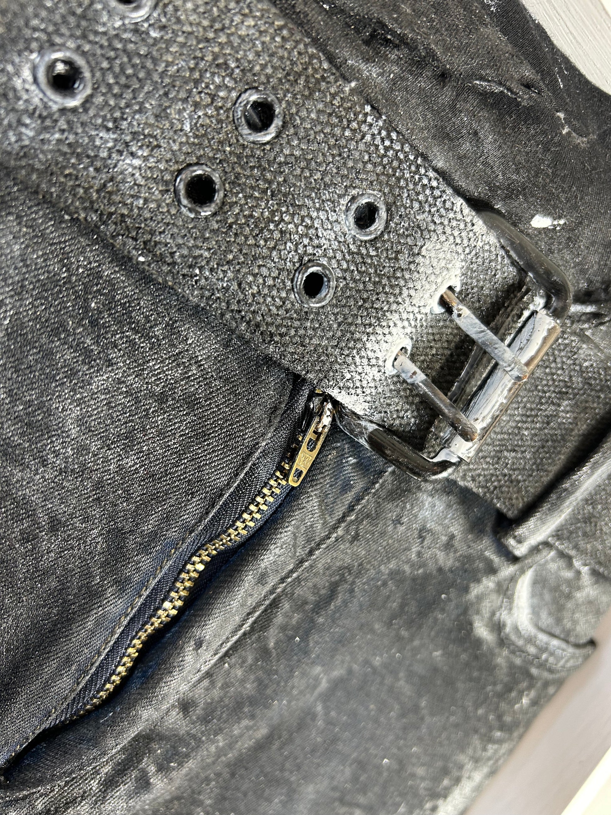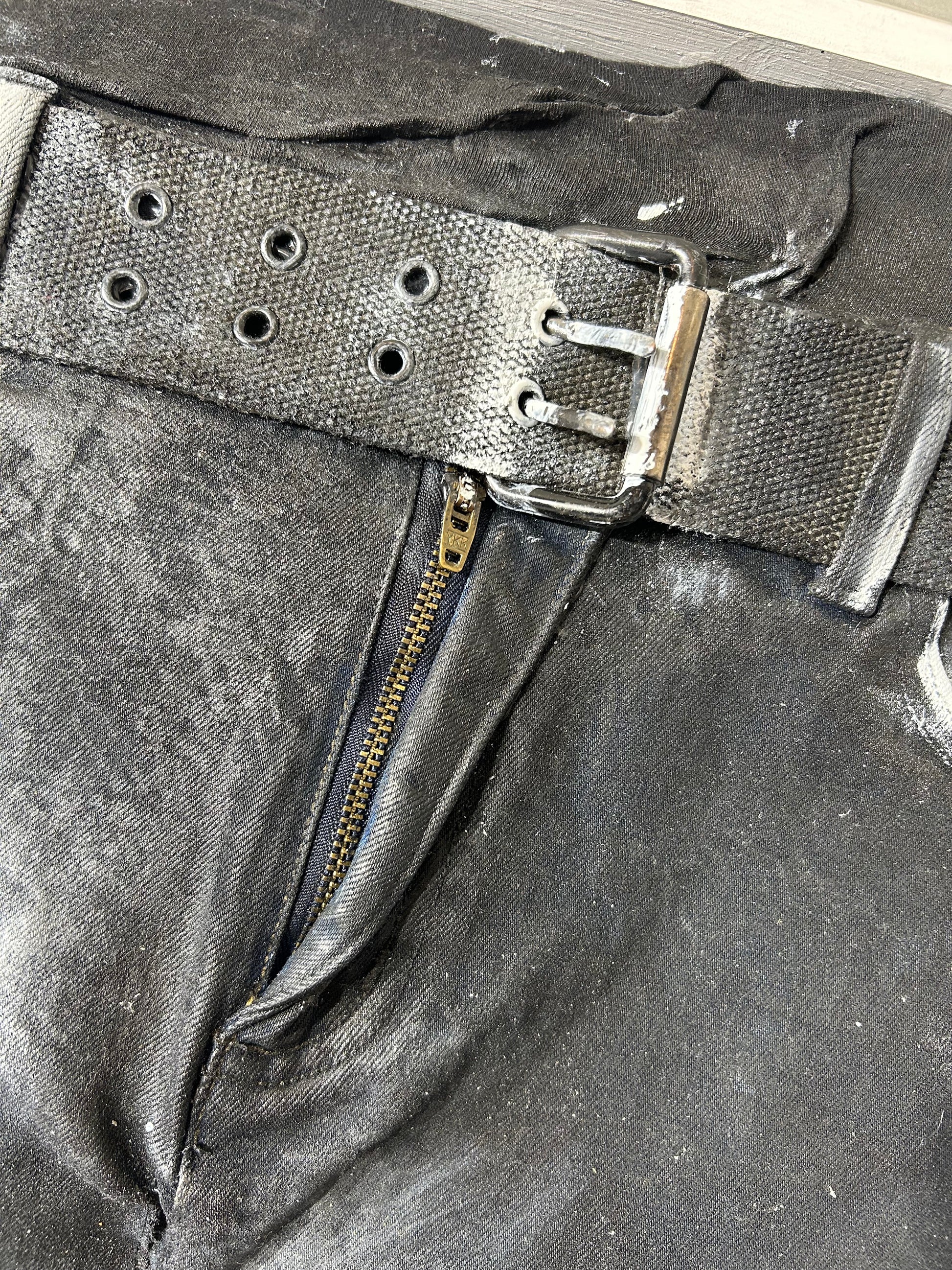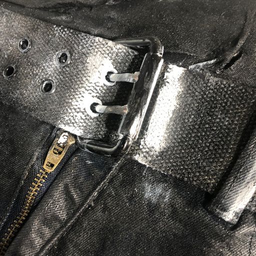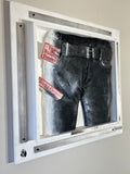 MATERIALS: Jeans with working zipper, cloth, metal chains, woods, acrylics & oils.