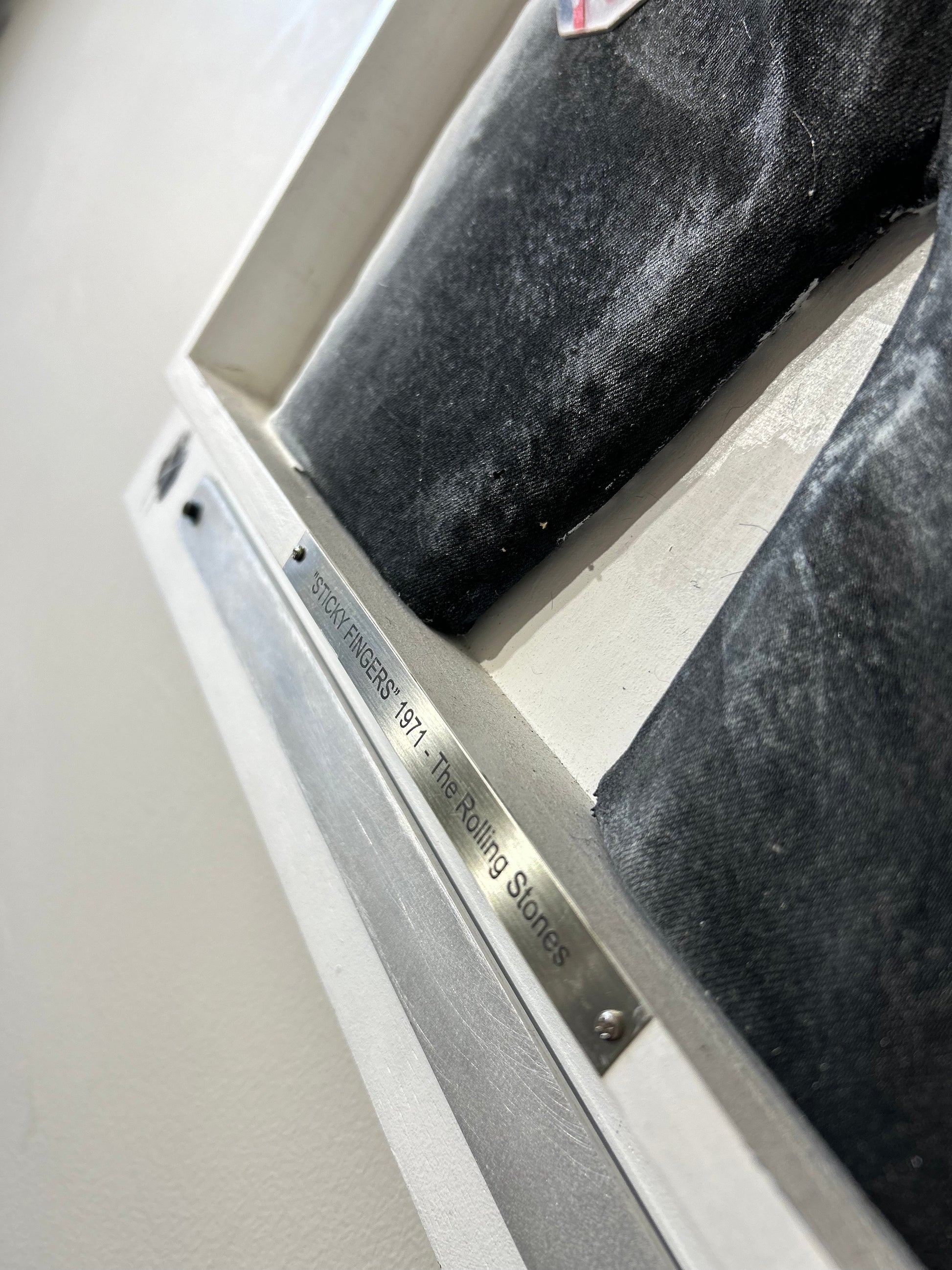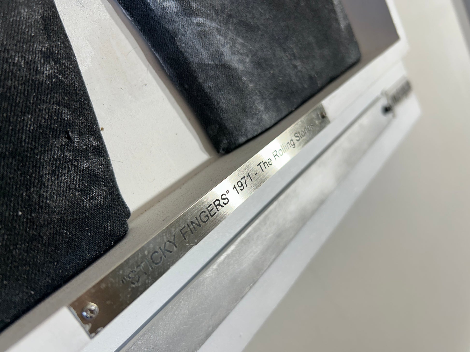 ENGRAVED METAL PLATE: 5" x 1/2": "STICKY FINGERS" 1971 - The Rolling Stones